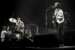 The production was bigger, with colorful graphics flashing on the huge screens around them, but the music remained rooted in